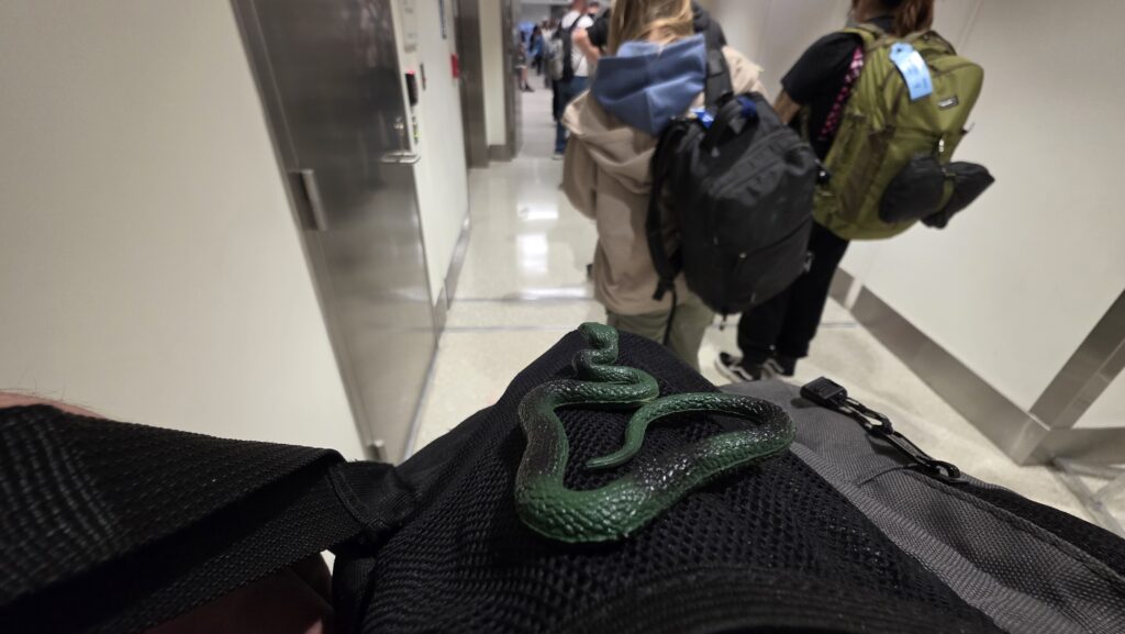 Steve said, “No really, dude, seriously?! That’s a heron! Why are you making me pose in front of this little lake if there is a snake eating bird there?”