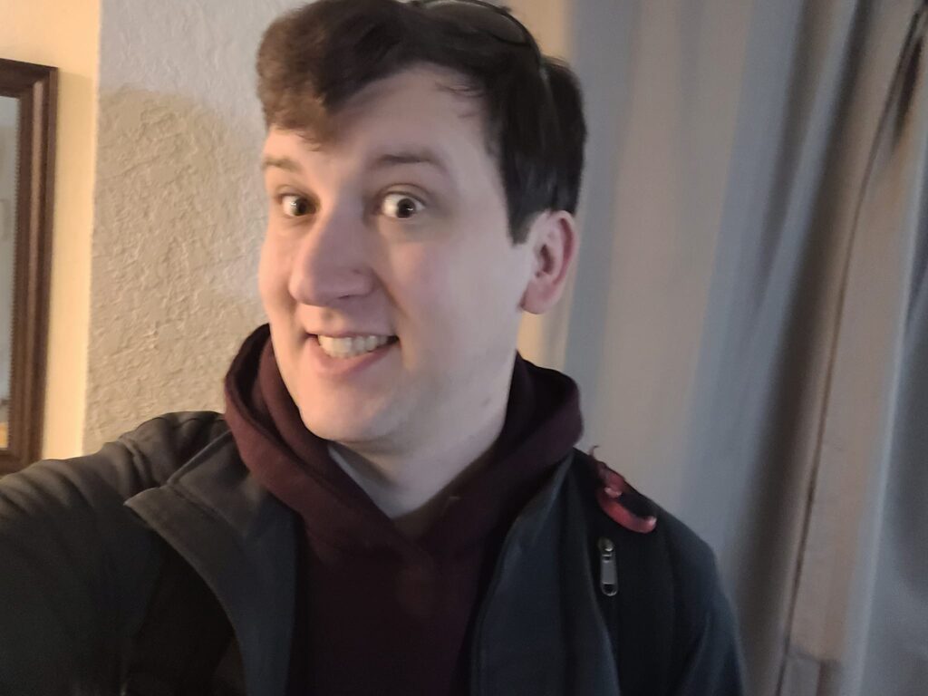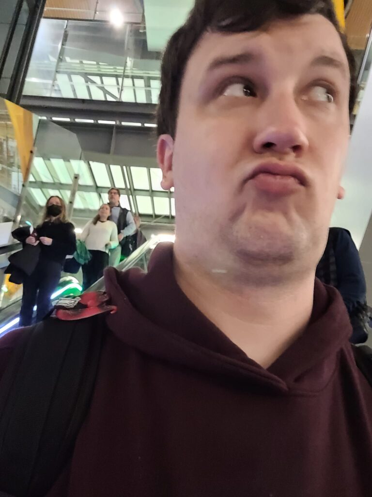 Description: selfie of William with a red plastic toy snake on his shoulder, making a slightly self-assured duck face in amazement at how easy getting through border control was.
