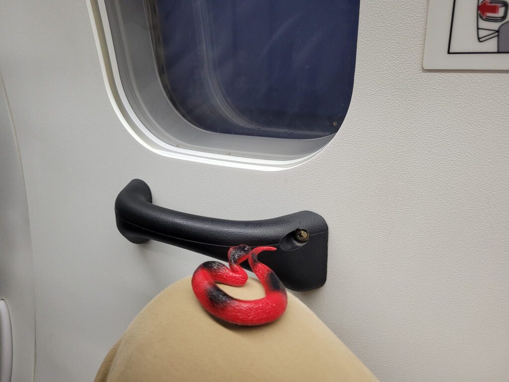 Description: a red plastic toy snake sitting on a khaki-panted knee in front of an airplane window.