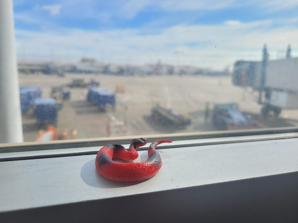Description: a red plastic toy snake sitting on the window sill overlooking an airport plane loading zone.