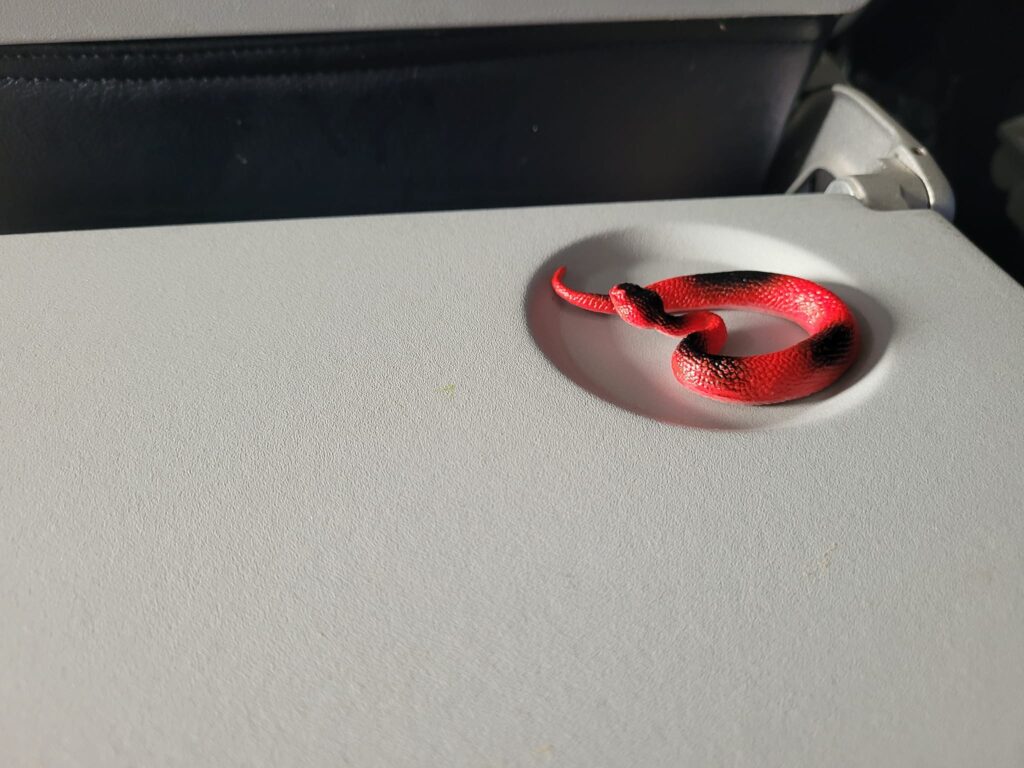 Description: a red plastic toy snake sitting in the cup holder of an airplane seat back tray.