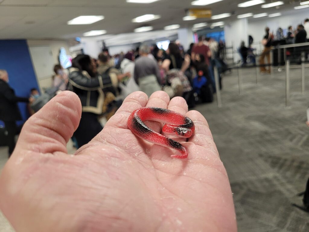 Description: a red plastic toy snake sitting on a sketchy dry skin looking hand in front of a crowd of people in an airport