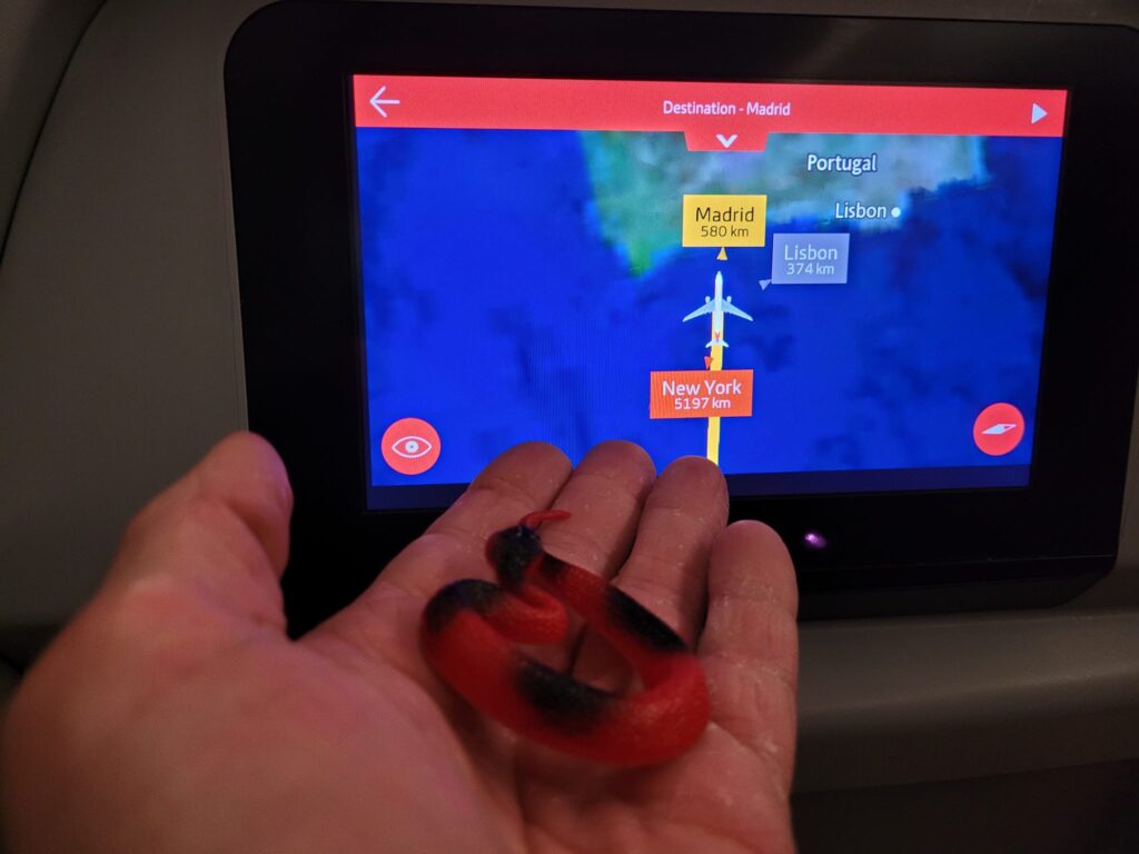 Description: a red plastic toy snake sitting on that sketchy palm again, staring at an airplane seat back flight tracker.