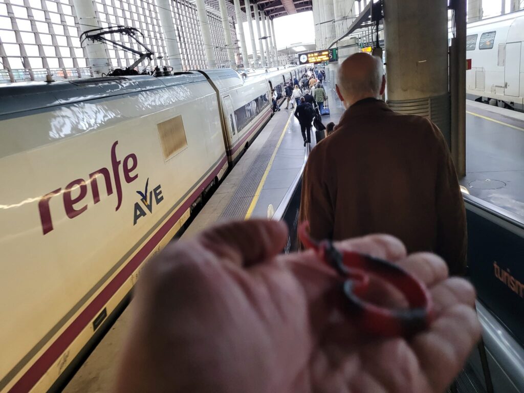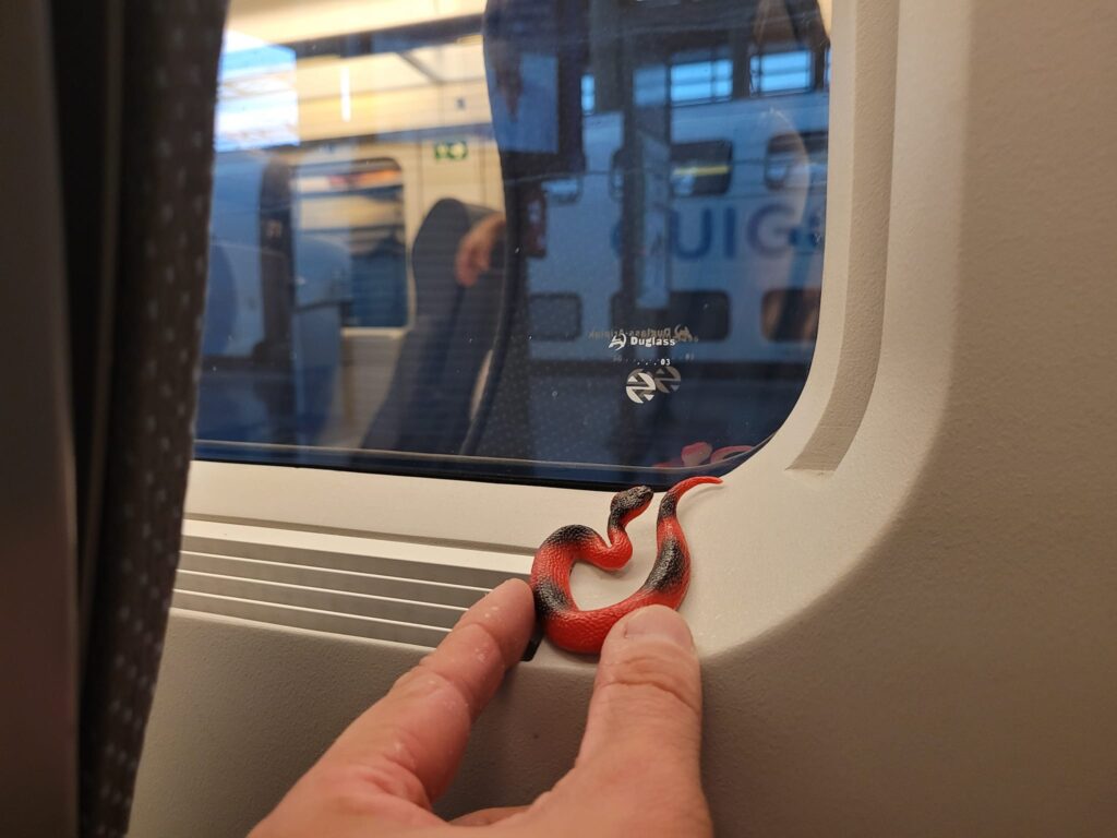 Description: a red plastic toy snake sitting on that sketchy palm looking at the Renfe train they’re about to get on in Atocha, headed south.