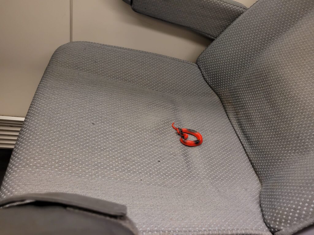 Description: a red plastic toy snake sitting on a grey train seat.