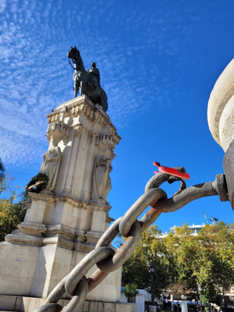 Description: a red plastic toy snake sitting on top of a chain next to a post, looking up at a large equestrian statue on a tall column.