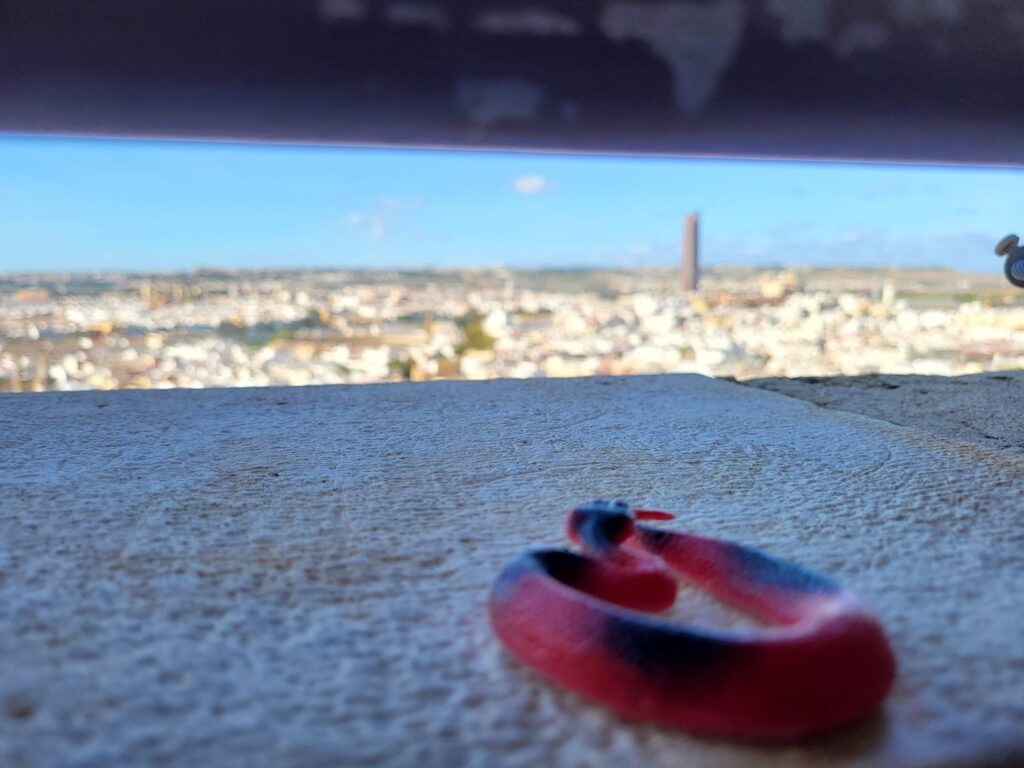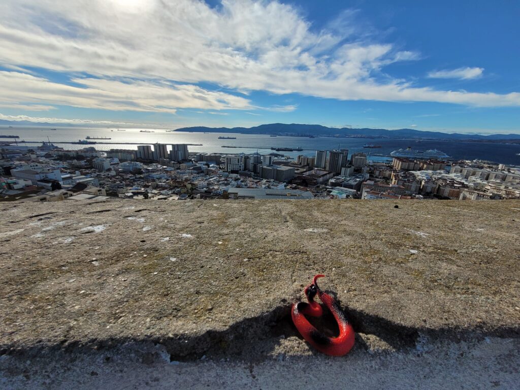Description: a red toy plastic snake sitting on a concrete wall overlooking the Gibraltar city and the Bay of Algeciras.
