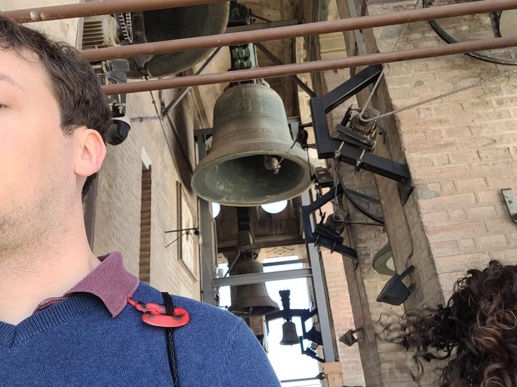 Description: a red plastic toy snake sitting on William’s left shoulder with a series of bells in the air above them suspended along a walkway at the top of a tower.