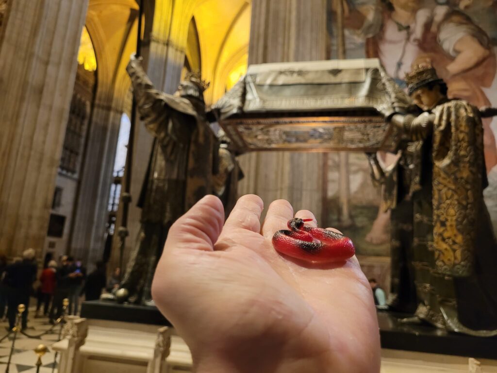 Description: a red plastic toy snake blurry in a hand in the foreground with a Gothic ribbed vault aisle receding into the background.