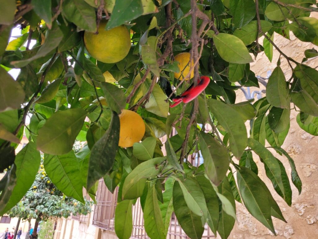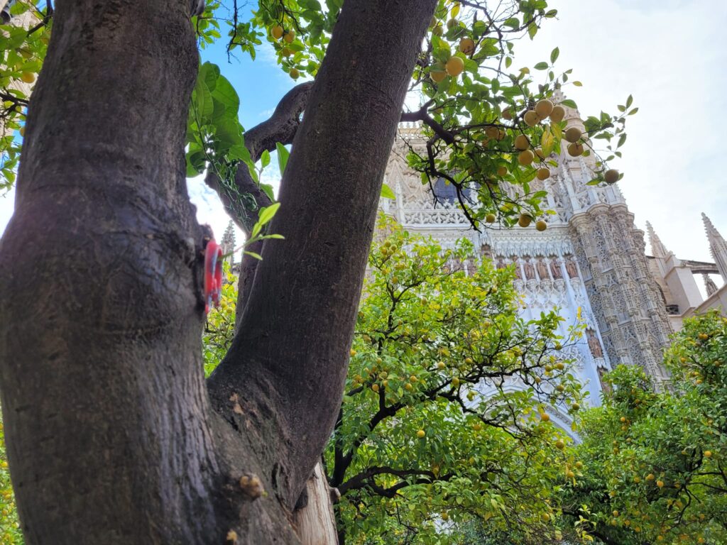 Description: a red plastic toy snake hanging on a limb stump of an orange tree with clusters of oranges in the middle ground and the façade of the Seville Cathedral in the background.