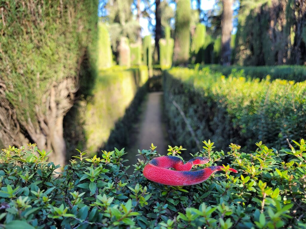Description: a red plastic toy snake sitting on a hedge bush leading down an aisle in a hedge maze.