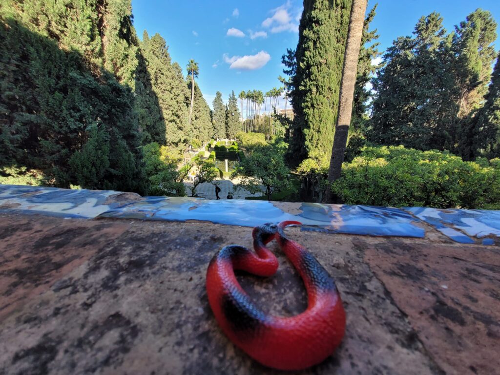 Description: a red plastic toy snake sitting on a sill immediately in front of some blue border tiles and overlooking linear gardens with receding lines of tall, shaped evergreens.