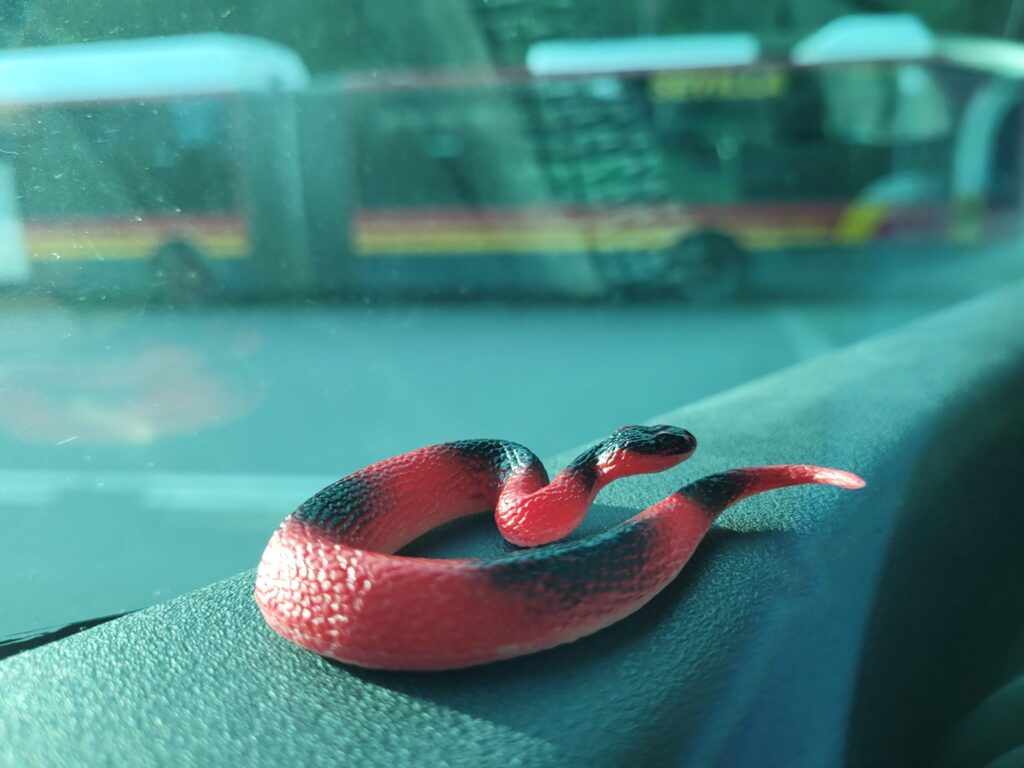 Description: a red plastic toy snake on a bus window will with blurred busses in the background.