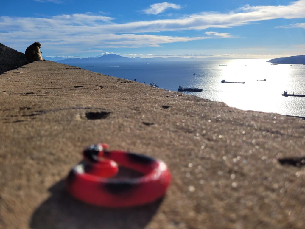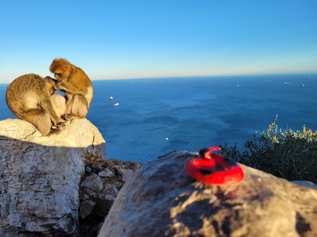 Description: a red toy plastic snake sitting on a diagonal stone wall stretch with a Barbary macaque in the left background with the blue water of the Bay of Algeciras blending in with the sky on the right.