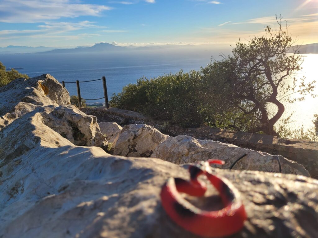 Description: a red toy plastic snake sitting on top of a rock looking on the Straight of Gibraltar with a green tree shrub in the middle ground.