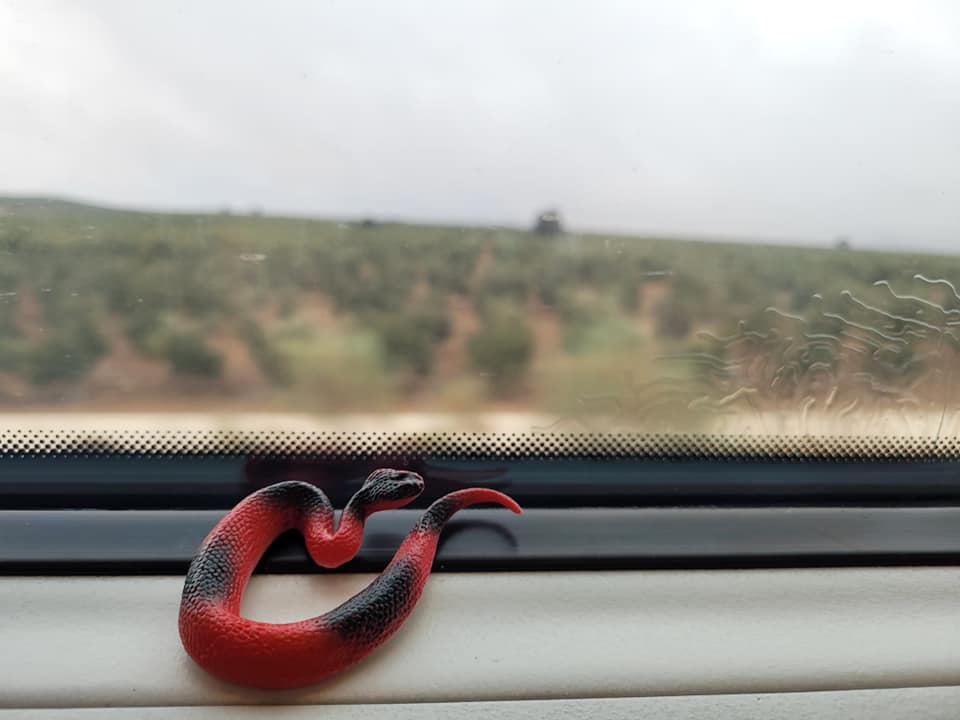 Description: a red toy plastic snake sitting on a train window sill with blurred lines of olive tree seen in the background.