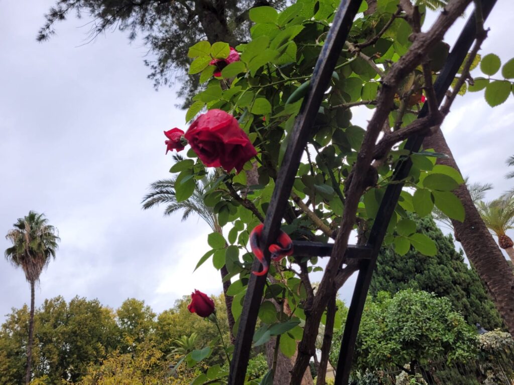 Steve stopped to smell the roses in the Alcazar gardens after sleeping in my pocket through the whole building